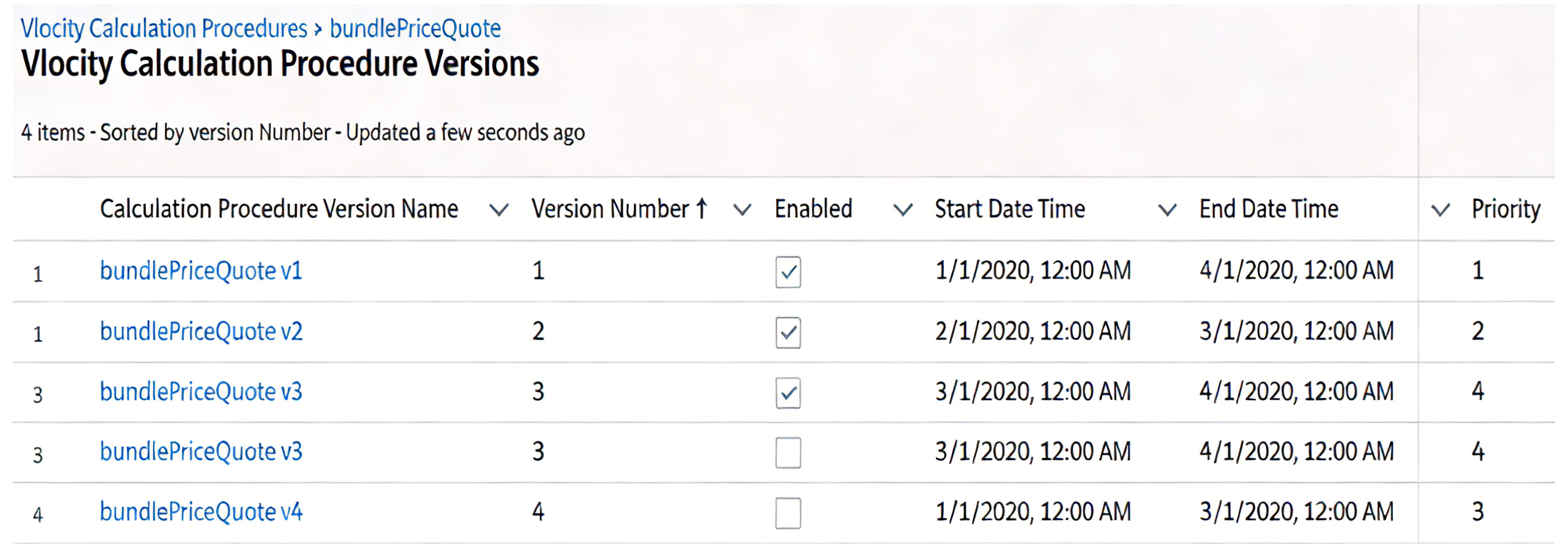 /2020 12:00 AM, an end date time of 4/1/2020 12:00 AM, a priority of 1, and is enabled. The other versions either have a different start or end date time, a lower priority, or are not enabled.